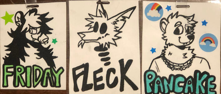 (drawn on small pieces of scrap paper left over from making bigger badges! a black/white bust doodle of your character with their name in one color of your choosing. cut, laminated, and shipped to you!)